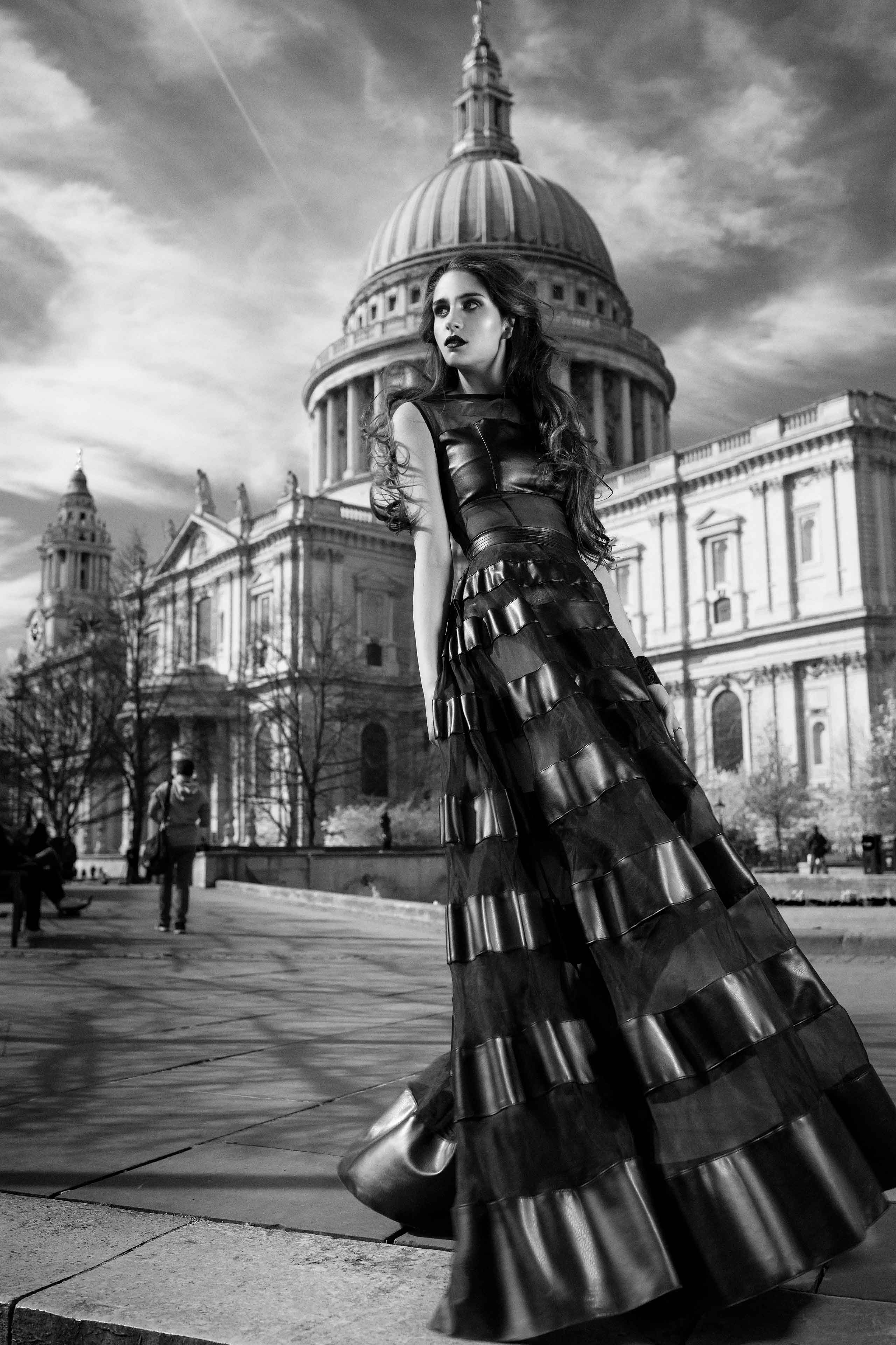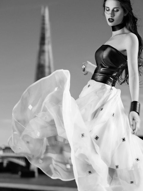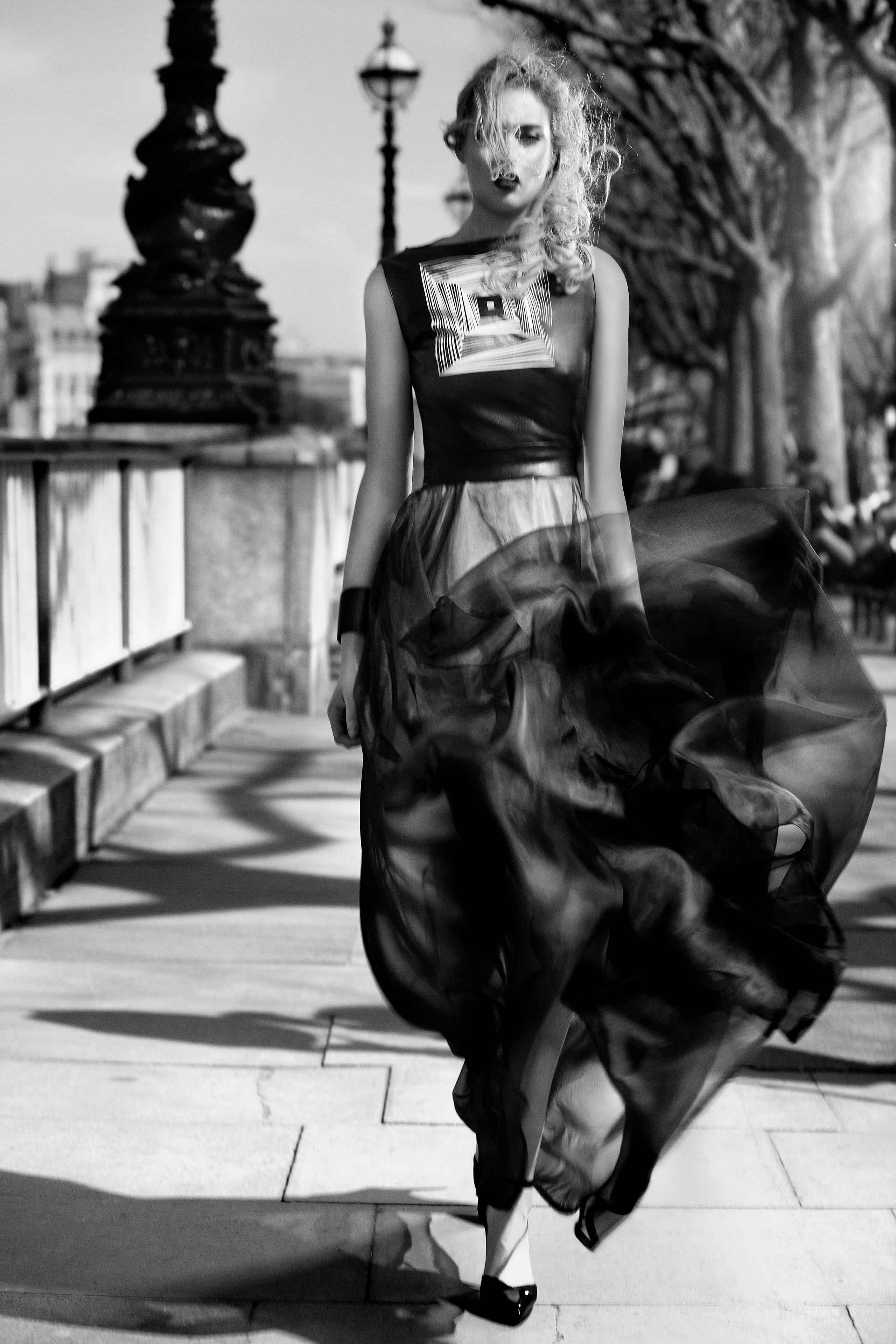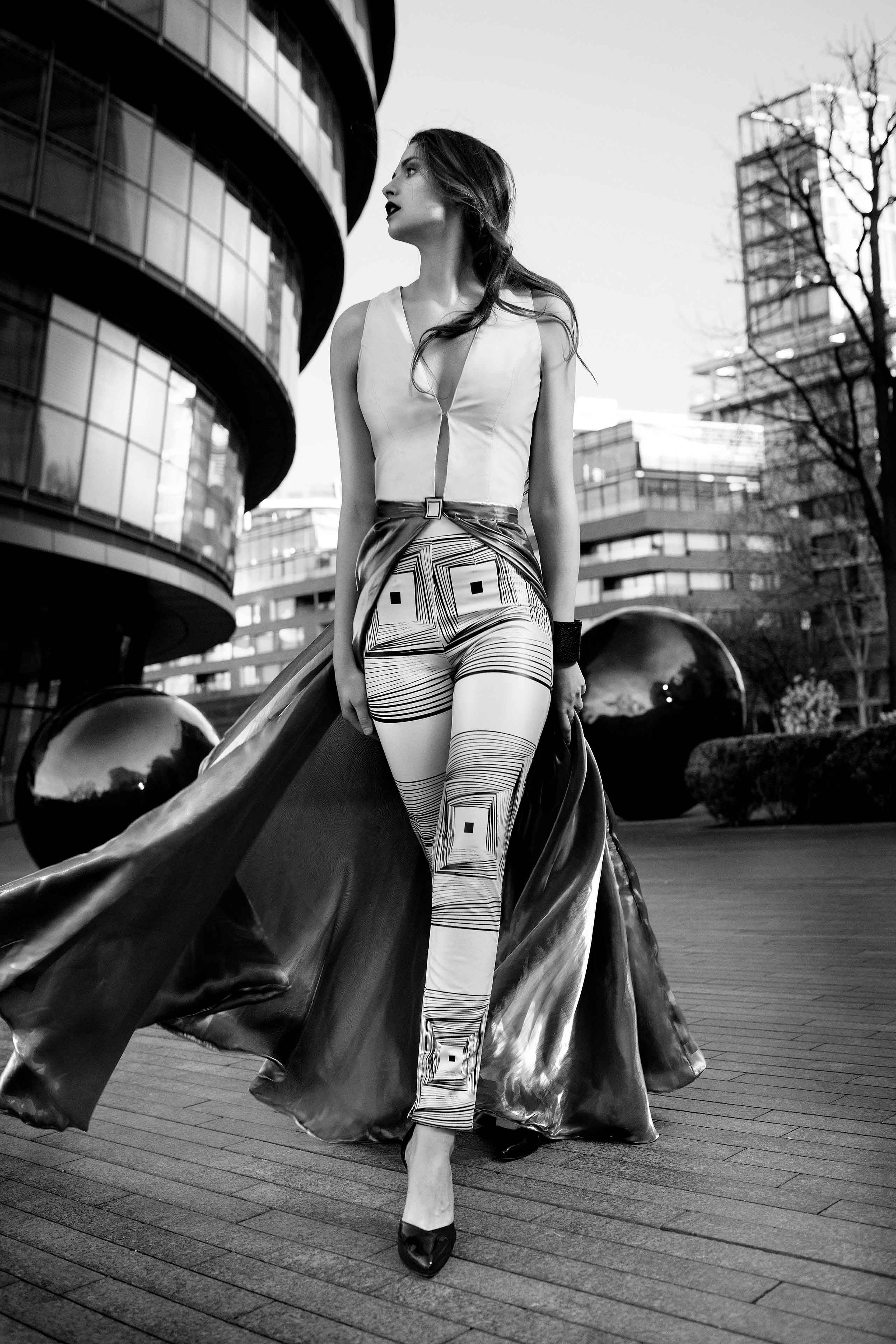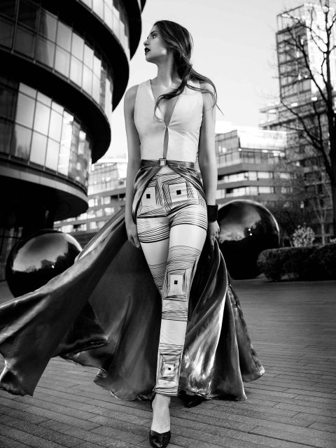La Collezione “Black&White in London” nasce dall’idea di una stampa Optical che è stata progettata graficamente dai corsisti di Fashion Graphic Design, poi stampata su Ecopelle e accostata ad un tessuto leggero come il Voile. Tecnicamente molto complesso accostare tessuti di natura così diversa e dal peso tecnico così differente… una vera e propria sfida per i nostri allievi!